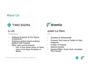 The document discusses improvements in Python and Spark performance achieved through interoperability with Apache Arrow, highlighting the current limitations of PySpark user-defined functions (UDFs) and the benefits of using Arrow's columnar format. It presents the advantages of vectorized UDFs over scalar UDFs, including significant speed improvements, and outlines a future roadmap for further advancements in PySpark and Arrow integration. Key topics include enhancements in data processing efficiency, the introduction of groupby().apply() for better UDF handling, and ongoing efforts within the Apache Arrow community.