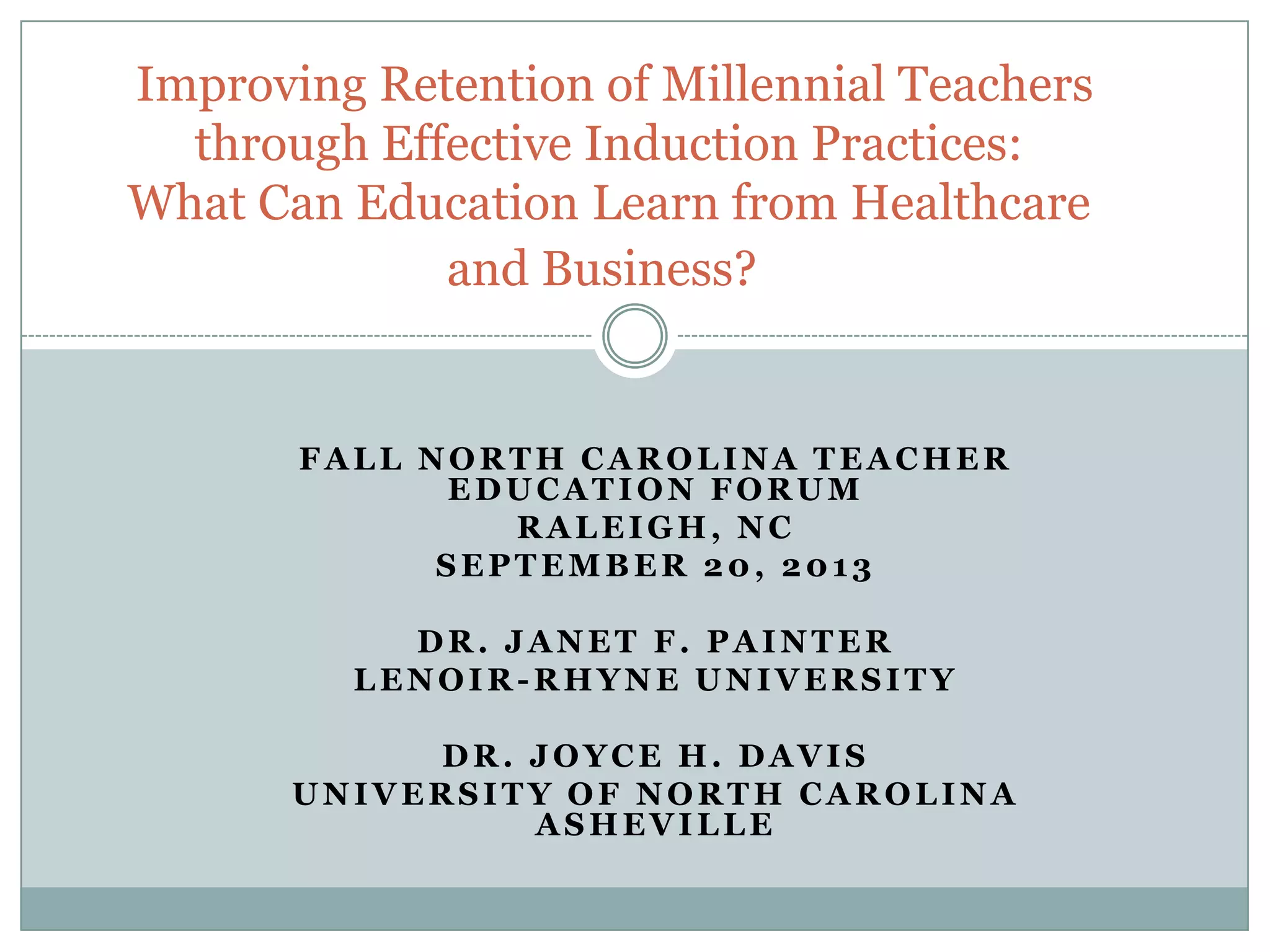 This document summarizes a presentation given by Dr. Janet F. Painter and Dr. Joyce H. Davis on improving retention of millennial teachers. It discusses the characteristics of millennial workers and challenges they present for traditional institutions. Examples are given of successful recruitment and retention strategies used by companies like Deloitte, Cisco Systems, and Carolina Healthcare Systems that could be applied to the education field. These include clear communication, opportunities for collaboration, customized recognition programs, flexible work arrangements, and professional development. The document concludes by considering what teacher educators can learn from other fields to better engage and retain millennial students and teachers.