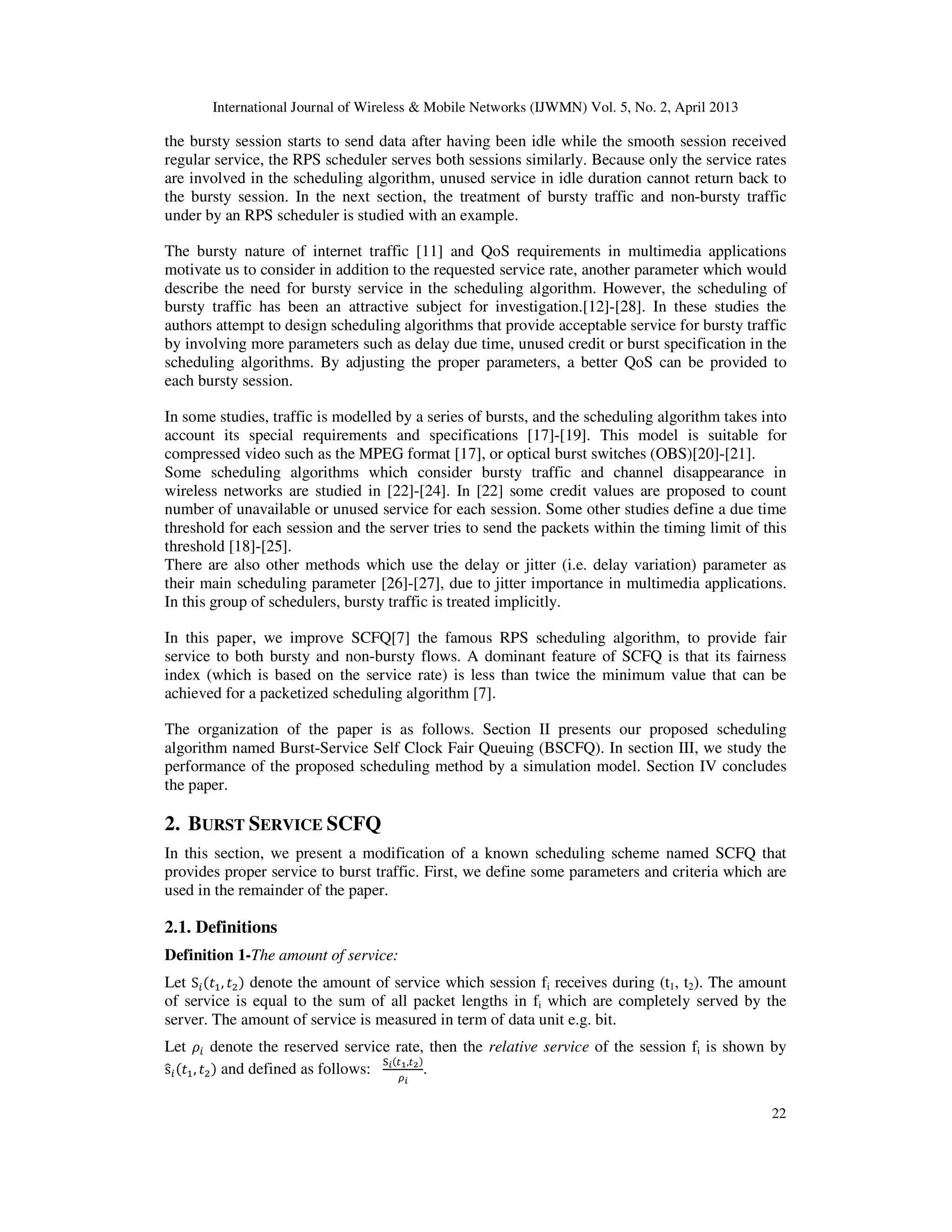 The document presents an improved scheduling algorithm named Burst-Service Self Clock Fair Queuing (BSCFQ) designed to enhance quality of service (QoS) for bursty traffic in multimedia networks. This algorithm modifies the well-known SCFQ to better accommodate burst delays by introducing a compensable service threshold without requiring additional computation. The performance evaluation through simulations shows that BSCFQ effectively reduces average packet delays for bursty sessions compared to traditional methods.
