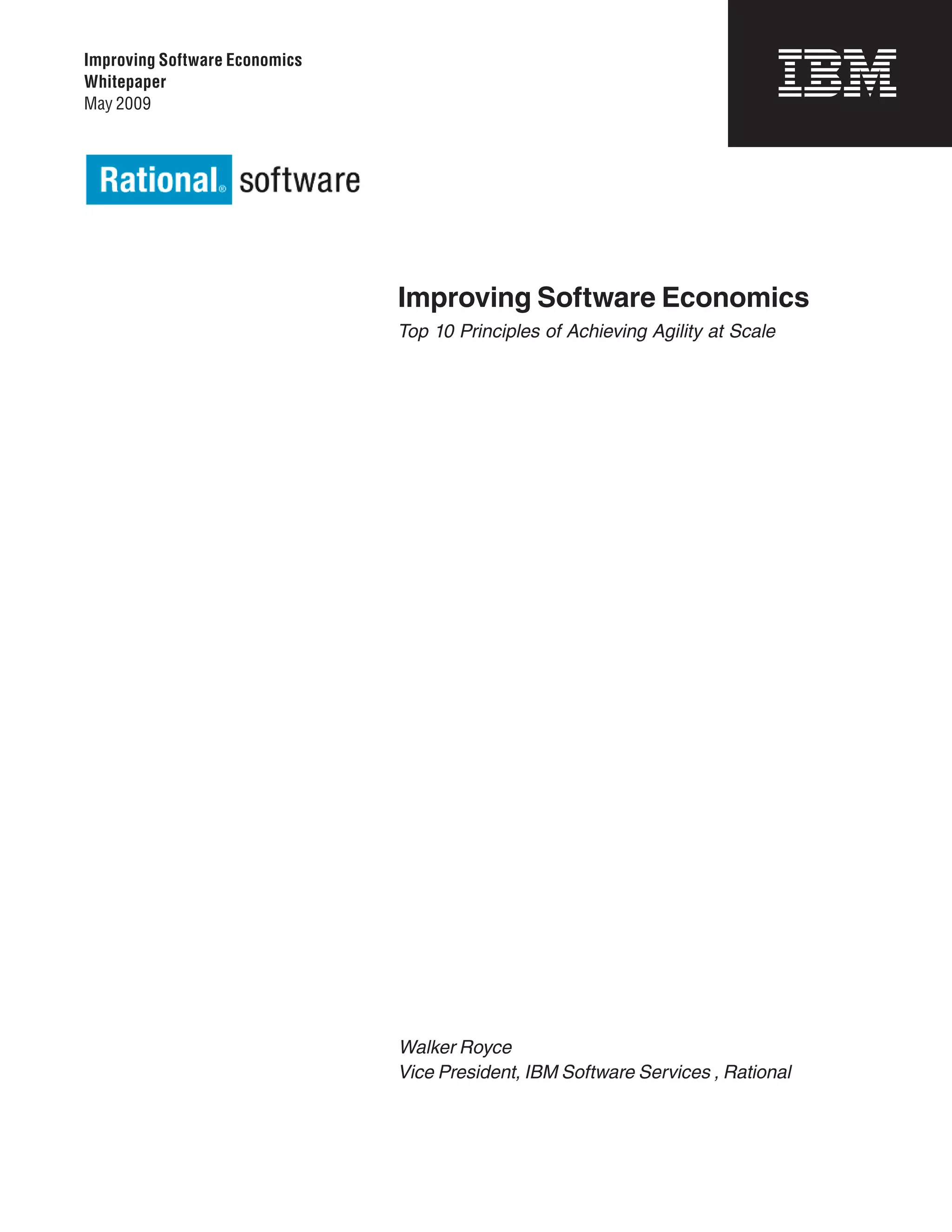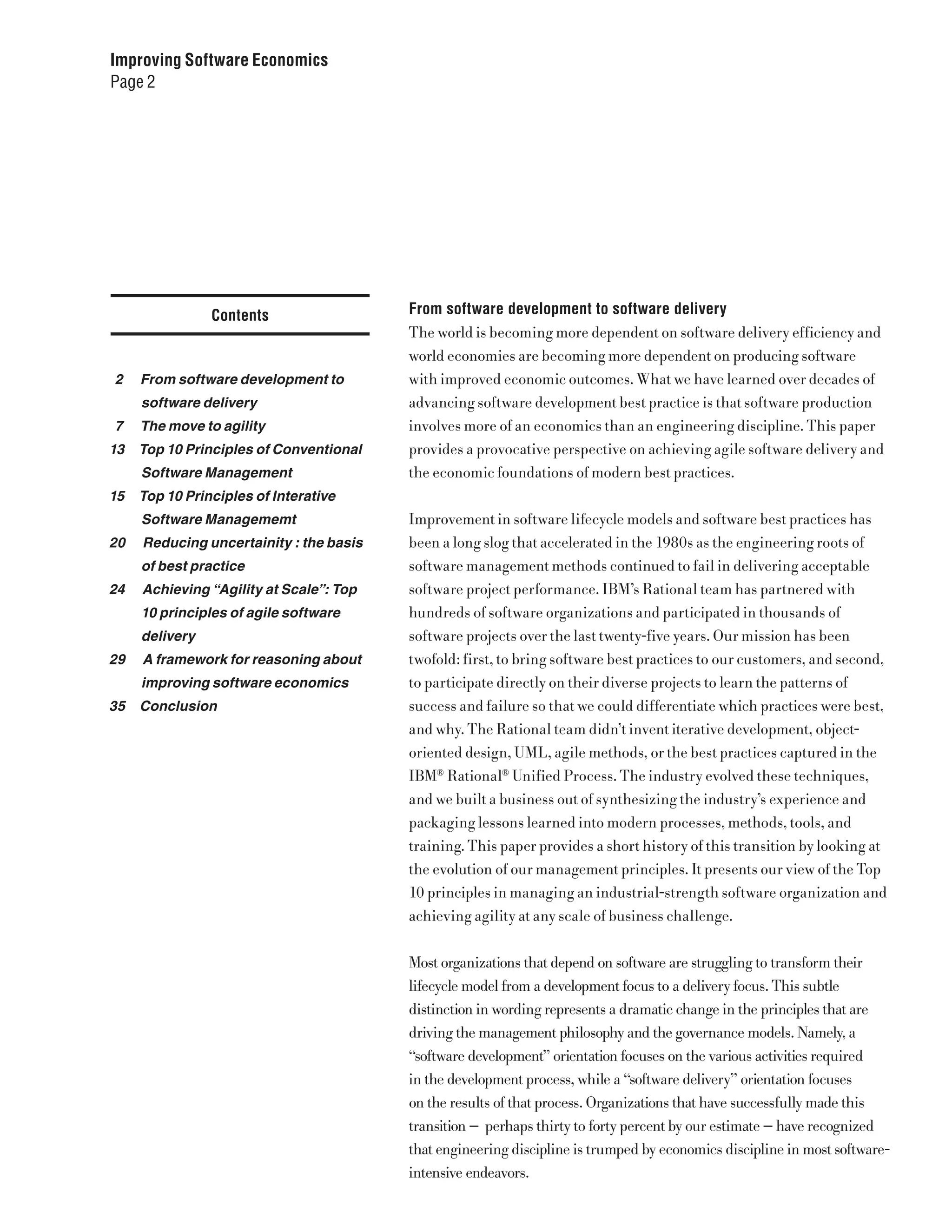 The document discusses the evolution of software development towards agile delivery, emphasizing the importance of economic principles over engineering practices in achieving software delivery efficiency. It identifies a significant shift from a development-oriented approach to a delivery-focused mindset that prioritizes measurable results and quality. The paper presents top principles in software management and highlights the transition from conventional waterfall processes to modern agile methodologies to improve success rates in software projects.