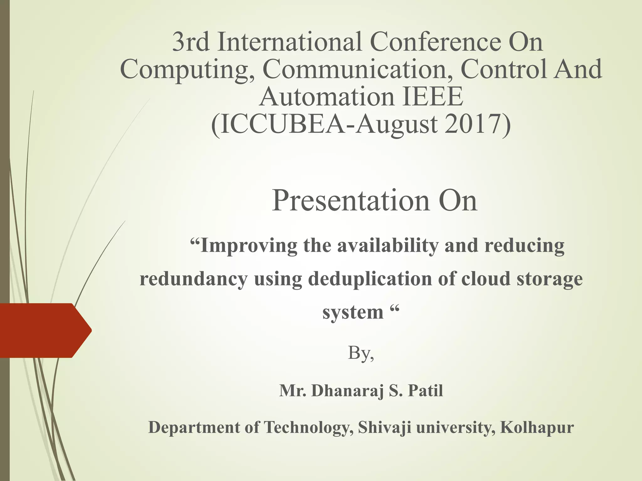 This document presents a study on improving cloud storage systems by addressing data redundancy through a data deduplication technique. It introduces the use of the MD5 algorithm for file verification and versioning, aiming to enhance data availability and durability. The proposed hybrid redundancy scheme is evaluated against existing systems, with promising results in reducing redundancy while maintaining data accessibility.