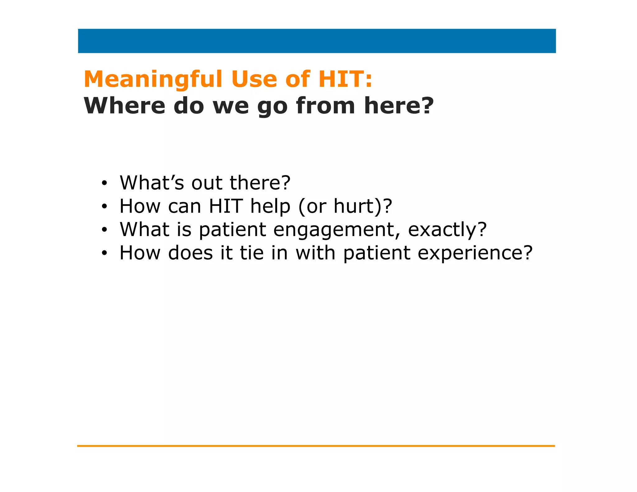 The presentation discusses enhancing patient experiences through health information technology (HIT) and how meaningful use of HIT can improve patient engagement, care quality, and health outcomes. It covers the importance of patient-centered approaches, the impact of technology on communication, and provides a roadmap for hospitals to integrate HIT effectively. Various studies highlighted in the presentation indicate differing preferences and levels of engagement among patients of different demographics regarding the use of patient portals and other technologies.