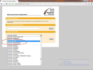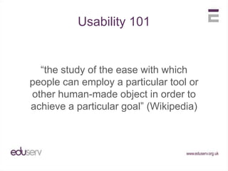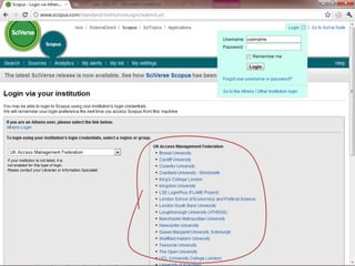 The document discusses usability in the context of federated access management, outlining key elements such as learnability, efficiency, memorability, errors, and satisfaction. It highlights challenges faced by institutions and publishers in providing consistent user experiences due to varying interfaces and multiple identity providers. The conclusion emphasizes the need for improved consistency and acknowledges ongoing efforts and studies aimed at enhancing usability across different platforms.