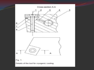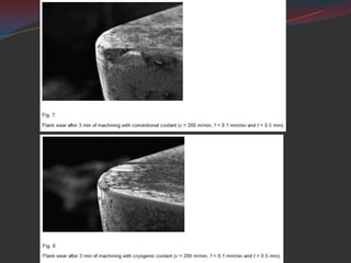 This document discusses a study on improving tool life in machining stainless steel using cryogenic cooling. The methodology involved machining stainless steel with conventional coolant and liquid nitrogen coolant. Results found that cryogenic cooling substantially increased tool life, with improvements over 4 times at higher cutting speeds and feed rates. Cryogenic cooling was more effective at higher speeds and feeds where more heat is generated. In conclusions, the cryogenic cooling method effectively cooled cutting edges and increased tool life without polluting the environment.