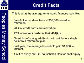 The document provides information about improving your credit and reducing debt. It discusses average credit statistics for Americans, how to review your credit report and score, strategies for correcting errors and reducing debt through budgeting, paying off high-interest debts first, and finding additional sources of money like home equity loans or second jobs. Specific tips include stopping unnecessary spending, using debit cards, selling expensive items, and creating a budget that accounts for both discretionary and non-discretionary expenses. Getting help from professionals like a CPA is also recommended.