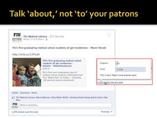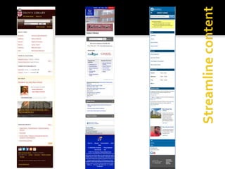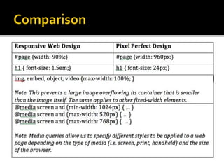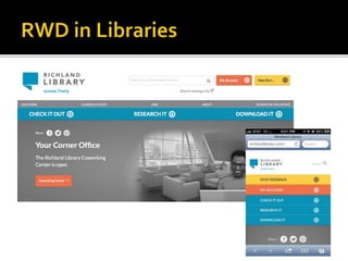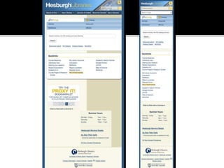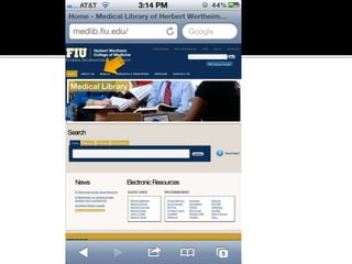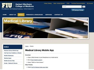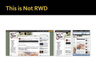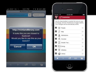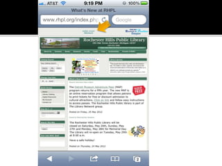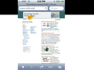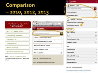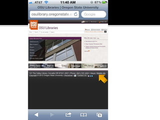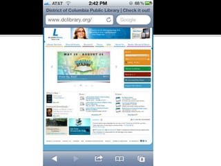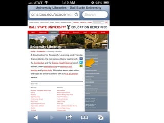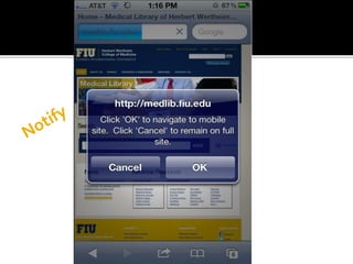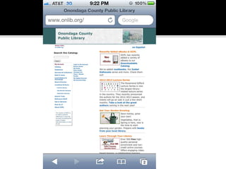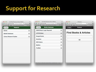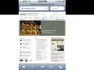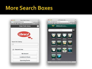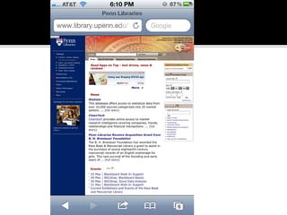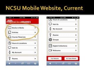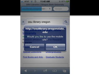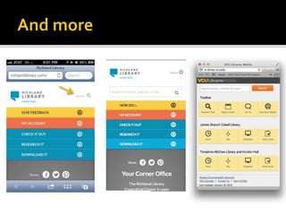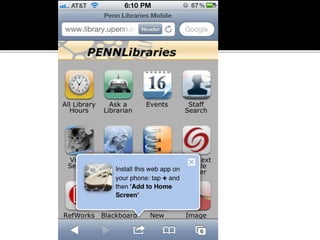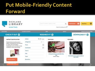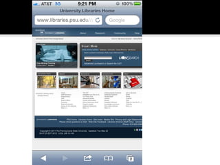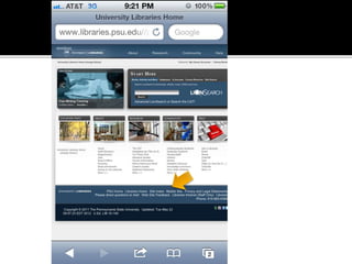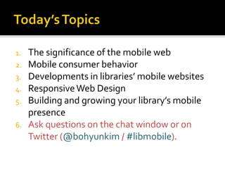 The document summarizes a presentation on developing libraries' mobile websites. It discusses the significance of the mobile web and mobile consumer behavior. It also covers responsive web design, building a library's mobile presence, and taking questions. Several studies and reports on mobile usage are referenced, finding that people spend over two hours per day on their smartphones, mostly browsing the internet, social media, and listening to music. The document advocates for offering more than basic information on mobile websites, including research tools and customizable personalization. It provides examples of features found on advanced library mobile websites.