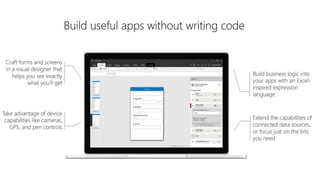 This document introduces Microsoft Flow and PowerApps, two new offerings for automating workflows and building custom apps in Office 365. Flow allows non-developers to automate tasks and connect apps and services without code. PowerApps enables users to build custom mobile apps for business needs using a no-code interface. Examples are provided of creating SharePoint-focused apps and flows. Roadmaps are presented for upcoming features in both Flow and PowerApps, including expanded connectivity, approvals functionality, and support for additional platforms and devices. Pricing models are also briefly outlined.