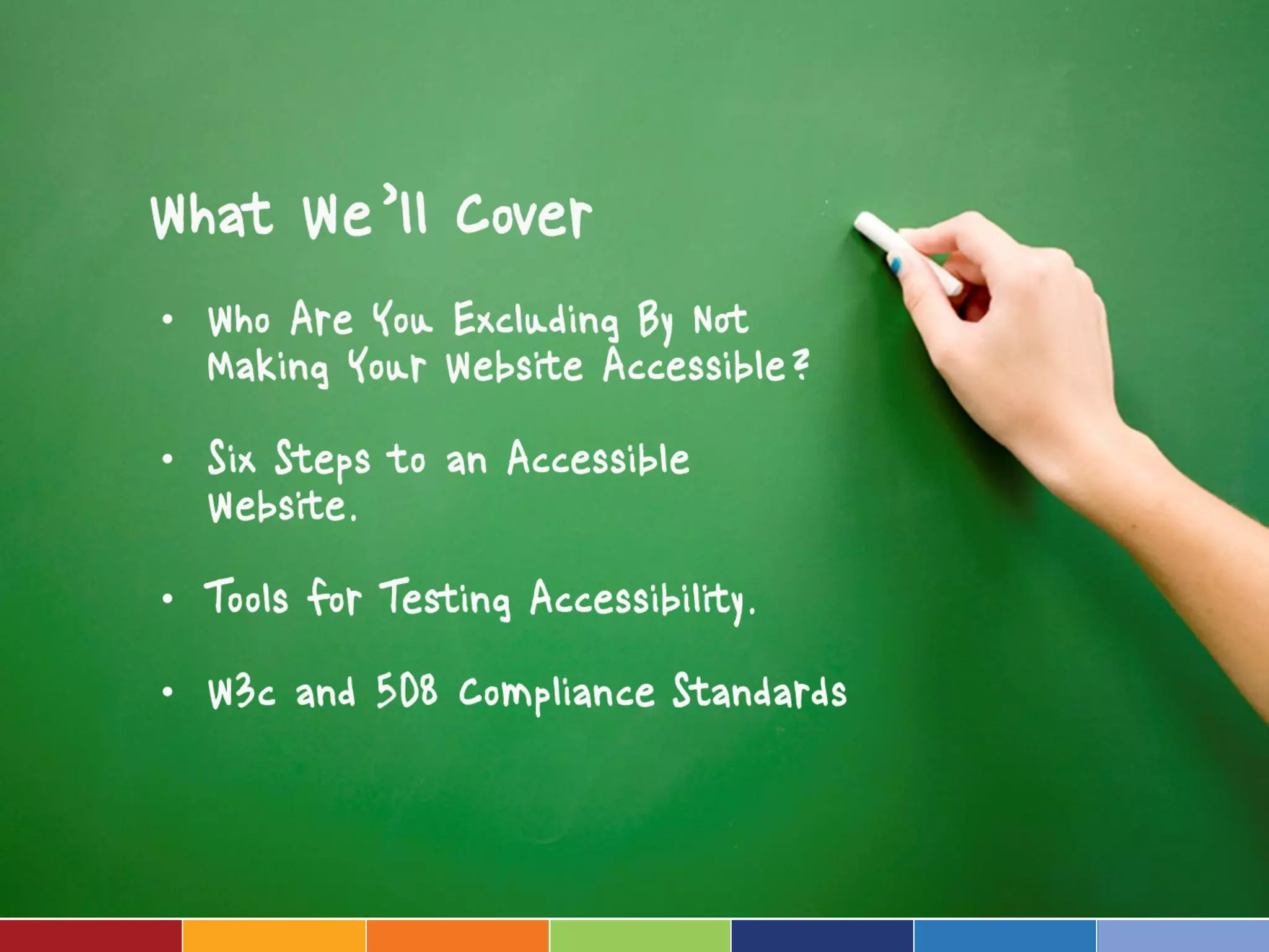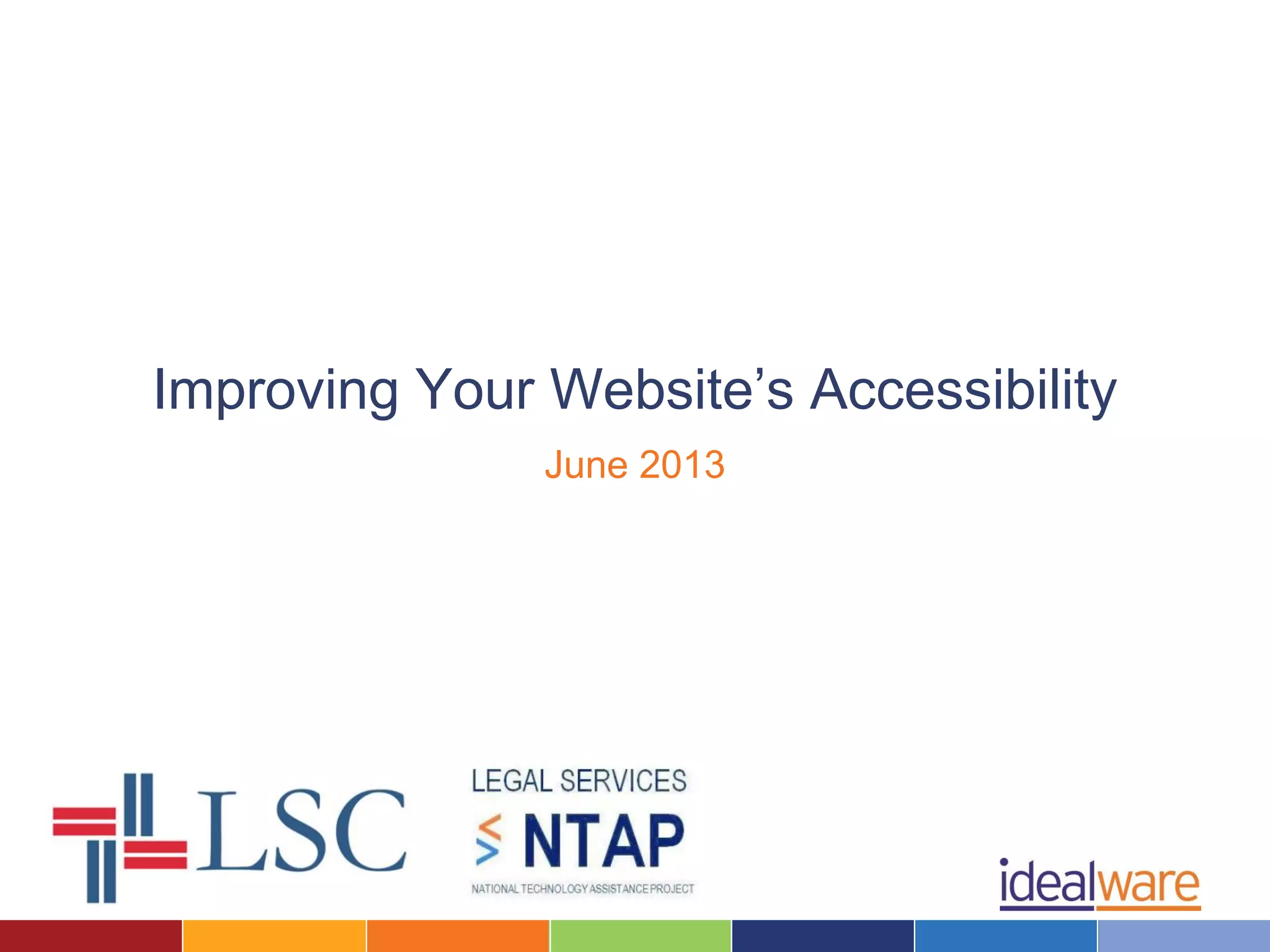 This document provides guidance on improving website accessibility. It discusses making websites accessible to people with disabilities, including those who are color blind, have low vision, difficulty using their hands, are deaf, have low English proficiency, are unfamiliar with technology, or have slow internet speeds. It provides six steps for an accessible website: 1) make text accessible, 2) provide alternatives to images, 3) use high contrast text, 4) accommodate screen readers, 5) support non-mouse users, and 6) code according to standards. Compliance with W3C and Section 508 standards can help ensure websites are accessible to all.