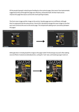 The document describes revisions made to improve magazine pages based on feedback from classmates. Minor issues like spelling errors were corrected. Text columns were aligned using rulers to improve consistency. The amount of text in each column and placement of the title were adjusted to make the columns look more even. Feedback also suggested adding a quote and image to break up blocks of plain text. A quote was added and the image and column layout were modified. Further changes improved consistency between the front cover and inside pages.