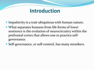 Impulse control disorders (ICDs) include oppositional defiant disorder, conduct disorder, intermittent explosive disorder, pyromania, and kleptomania. They are characterized by the inability to control impulsive behaviors that violate the rights of others or societal norms. The etiology is multifactorial involving genetics, family environment, social factors, and biological disturbances in the prefrontal cortex. Treatment involves parenting skills training, cognitive behavioral therapy, and sometimes medication, while differential diagnosis considers disorders with similar impulsive or oppositional symptoms like ADHD, mood disorders, and personality disorders that may co-occur.