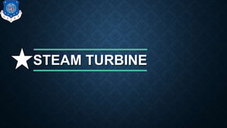 An impulse turbine uses jets of steam to turn blades and extract energy. The velocity triangle diagram shows the direction and relative velocities of the steam into and out of the stationary and rotating blades. The angles, velocities and other parameters in the diagram are used to analyze the impulse and reaction of the steam on the blades to transfer rotational energy.