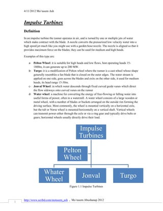 Impulse turbines use jets of water that make contact with turbine blades to turn the runner. Examples include Pelton wheels for high heads, Turgo turbines for medium heads, and Jonval wheels where water is directed sideways onto curved vanes. Pelton wheels can generate up to 200 MW and are best for heads from 15-1800m. Turgo turbines are a modified Pelton design used for heads from 15-30m. Calculations are provided for determining the speed and power output of a Pelton wheel turbine based on variables like water flow rate and velocity.