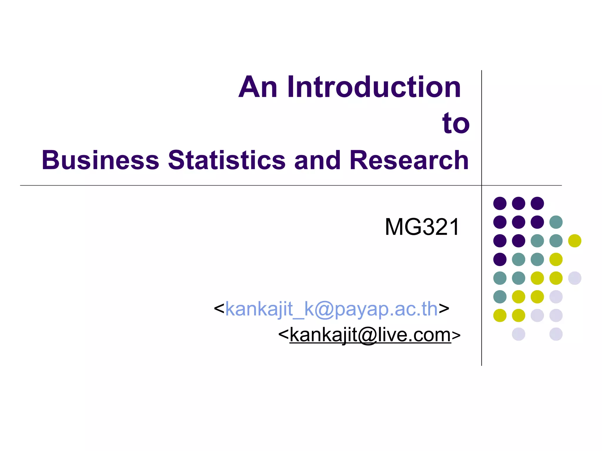 This document outlines an introduction to business statistics and research course. It includes an overview of the course content which covers topics such as research methods, research design, data analysis, and presentation of findings. The course schedule details weekly topics in business statistics including descriptive statistics, probability, sampling, and regression analysis. Assignments include an individual research project with components like a research proposal, questionnaire design, data analysis, and final presentation. Due dates are provided for submitting various assignment elements ranging from October to March.