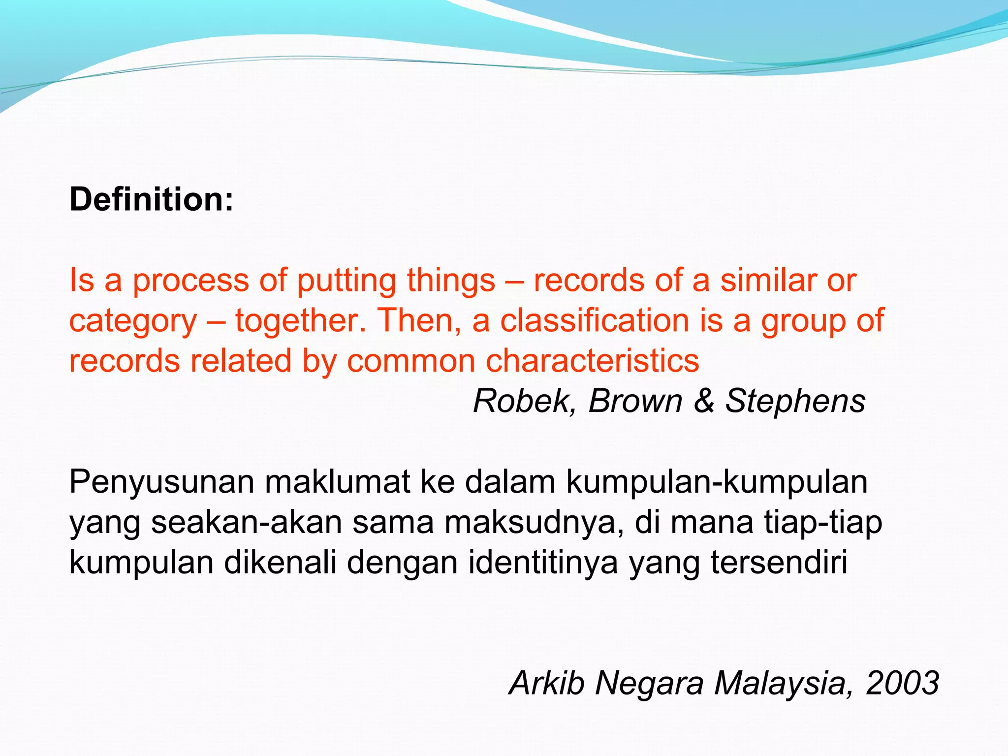 Classification is the process of organizing records into groups based on common characteristics. The primary reason for classification is to provide an overview of an organization's information and how the records fit together. It recognizes differences in records and allows for growth while providing guidance to users. An effective classification system is easy to understand, use, and maintain while supporting the organization's needs. It groups records by function and uses common terminology familiar within the organization.