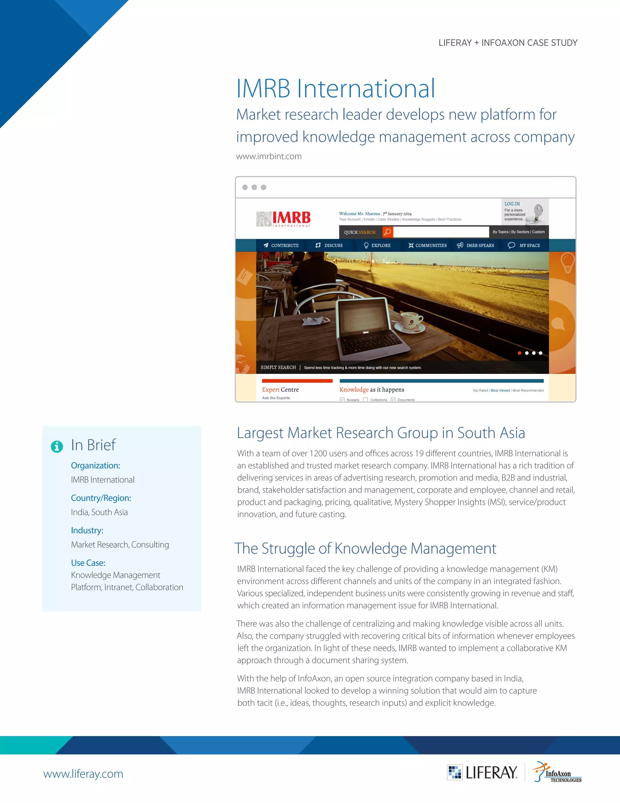 IMRB International, a leading market research company in South Asia, faced knowledge management challenges due to independent business units and information management issues. Partnering with InfoAxon, they implemented a collaborative knowledge management platform called 'mrb interchange' using Liferay's enterprise portal, which centralized information and improved access across units. The new system shifted the company culture towards knowledge sharing and significantly enhanced the repository of organizational knowledge, fostering growth and collaboration.