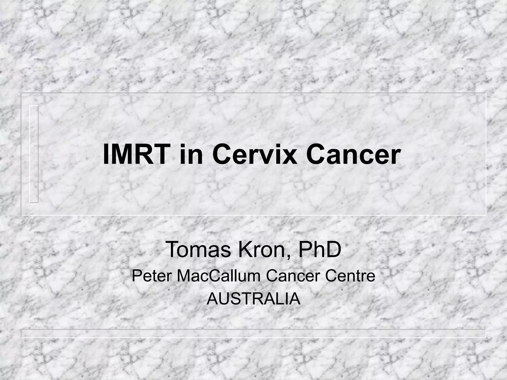 This document discusses the use of intensity-modulated radiation therapy (IMRT) for treating cervix cancer. It notes that IMRT is rarely used currently but could help reduce dose to normal tissues and potentially replace brachytherapy. The document outlines the need for accurate target volume definition using imaging like MRI and CT. It also describes the inverse planning process for IMRT and challenges like organ motion. While IMRT may help spare organs at risk, issues like increased leakage, integral dose and treatment time must be considered.