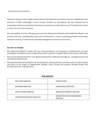 Autoenginiea offers comprehensive managed IT services aimed at optimizing business outcomes through digitalization and advanced technologies. Their service portfolio includes data center transformation, end-user computing, and network services, tailored to create user-centric workspaces and enhance operational efficiency. The company emphasizes expertise in hybrid IT setups, security, and the integration of open-source solutions to meet evolving enterprise needs.