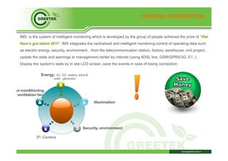 The document describes an Intelligent Monitoring System (IMS) that was developed to monitor operating data from telecommunication stations, factories, warehouses and other facilities. It integrates centralized and intelligent monitoring of parameters like energy, security, and environment. It updates the state and warnings to a management center via internet and displays the system state on an LCD screen. The IMS monitors and controls security, environment, energy usage and more. It allows remote management of equipment from anywhere via the network.