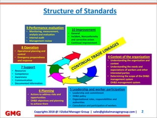 The document outlines the structure and requirements of an Occupational Health and Safety Management System (OH&S) including leadership, planning, support, operations, and performance evaluation. It emphasizes ethical and professional behavior for auditors during audits, detailing steps and criteria for assessment, documentation, and improvement. Additionally, it specifies the necessary information for risk assessment and management planning to achieve OH&S objectives.