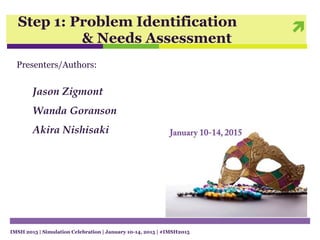 This document outlines a presentation on problem identification and needs assessment, which is the first step in designing a simulation-based educational program. It discusses identifying the problem and whom it affects, as well as general and targeted needs assessments. Several needs assessment methods are described, including interviews, focus groups, questionnaires, observation, tests, audits, and strategic planning. The presentation aims to help participants understand the importance of needs assessment in curriculum development and determine problems and appropriate assessment methods for case examples.