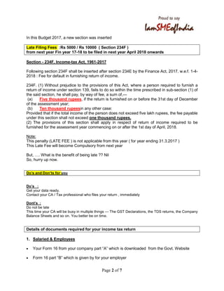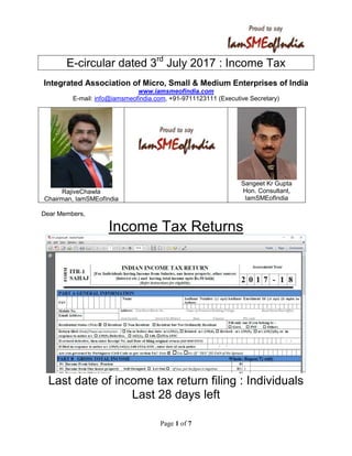 This document provides information and guidance to members on filing income tax returns before the deadline. It outlines the late filing fees that will be introduced next year, key documents and information needed to file returns, and answers frequently asked questions. Members are encouraged to file their returns on time and seek guidance from their tax professionals, as the government is cracking down on non-compliance. Details on foreign assets, cash deposits post demonetization, and linking of Aadhar must be provided accurately in returns.