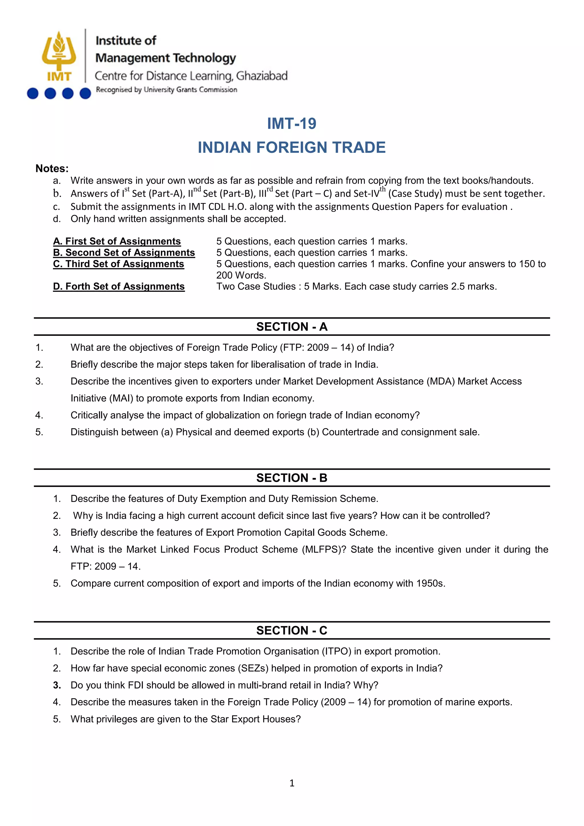 The document outlines the guidelines and assignments for a course on Indian foreign trade, detailing various case studies and questions related to trade policy and market strategies. It emphasizes the importance of original responses, the structure of assignment sets, and various topics including the role of special economic zones and the impact of globalization on trade. Additionally, it presents statistical growth in India's export sector, highlighting diversification into new markets and rising export figures despite challenges.