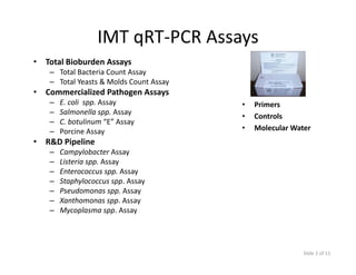 The document discusses Industrial Microbial Testing (IMT) and their quantitative real-time PCR (qRT-PCR) assays for testing microorganisms. IMT offers total bacteria count and total yeasts/molds count assays, as well as assays for pathogens like E. coli, Salmonella, C. botulinum, and others. The assays can be used to test various samples from food, pharmaceutical, aerospace and other industrial clients for applications like quality control, environmental monitoring, and product release testing.