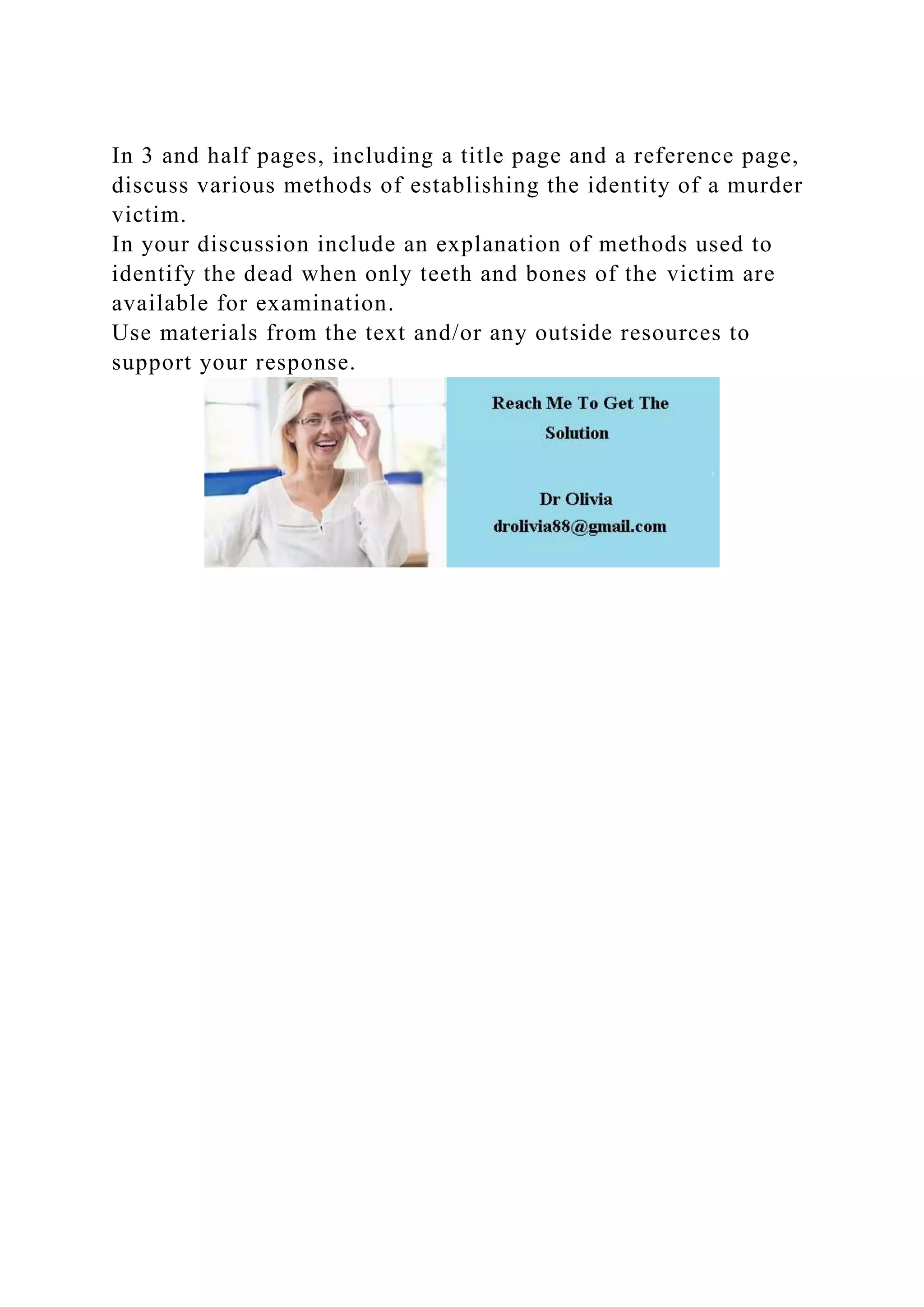 The document outlines various methods to establish the identity of murder victims, particularly focusing on situations where only teeth and bones are available for examination. It emphasizes forensic techniques like dental records comparison and osteological analysis to aid in identification. The discussion incorporates both textbook references and external resources to support the presented information.