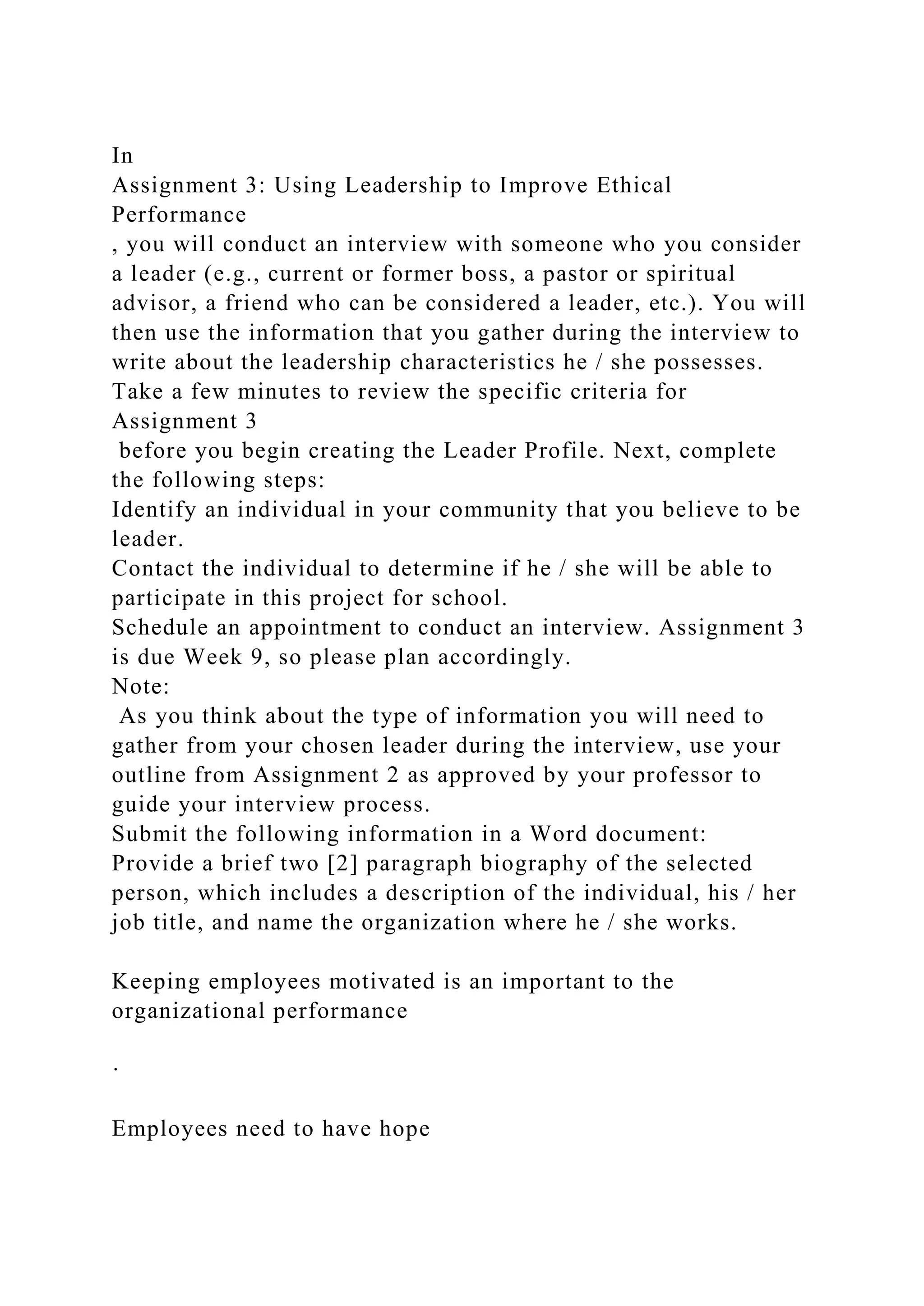 The document outlines Assignment 3, which involves interviewing a community leader to assess their leadership characteristics and ethical performance. Students are instructed to select an individual, gather biographical information, and schedule an interview, with a deadline for submission in week 9. Additionally, it emphasizes the importance of employee motivation through factors such as promotion, communication, and recognition in the workplace.