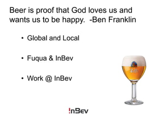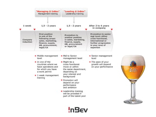 The document discusses the global and local nature of InBev, a large beer company. It emphasizes operating globally with global brands but also championing local markets. The company seeks ambitious graduates and experienced hires who are mobile and interested in helping shape InBev's future as it moves at an incredible pace across borders through various management roles over 1.5-2 years at each level from managing to leading to senior management. Applicants are encouraged to think and work globally and locally.