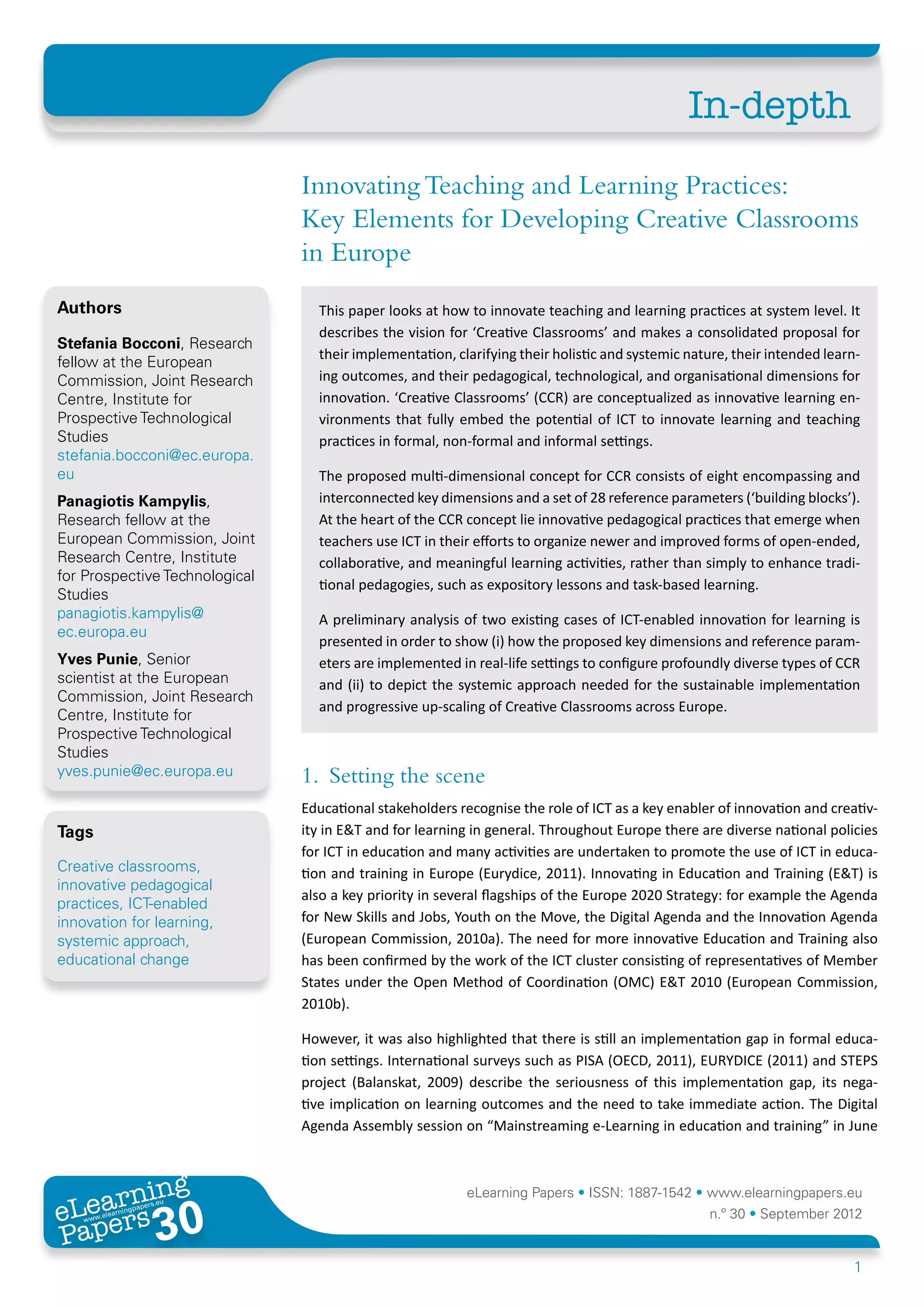 The document proposes a vision for 'creative classrooms' (CCRs) as innovative learning environments that leverage ICT to improve pedagogical practices across formal, non-formal, and informal settings in Europe. It outlines eight interconnected dimensions and 28 reference parameters that encompass the holistic nature of CCRs, emphasizing the need for collaboration and support from educational systems to effectively implement and scale these innovative practices. A preliminary analysis of existing ICT-enabled initiatives illustrates how these dimensions can be applied in real-world contexts, highlighting the importance of systemic approaches to educational change.