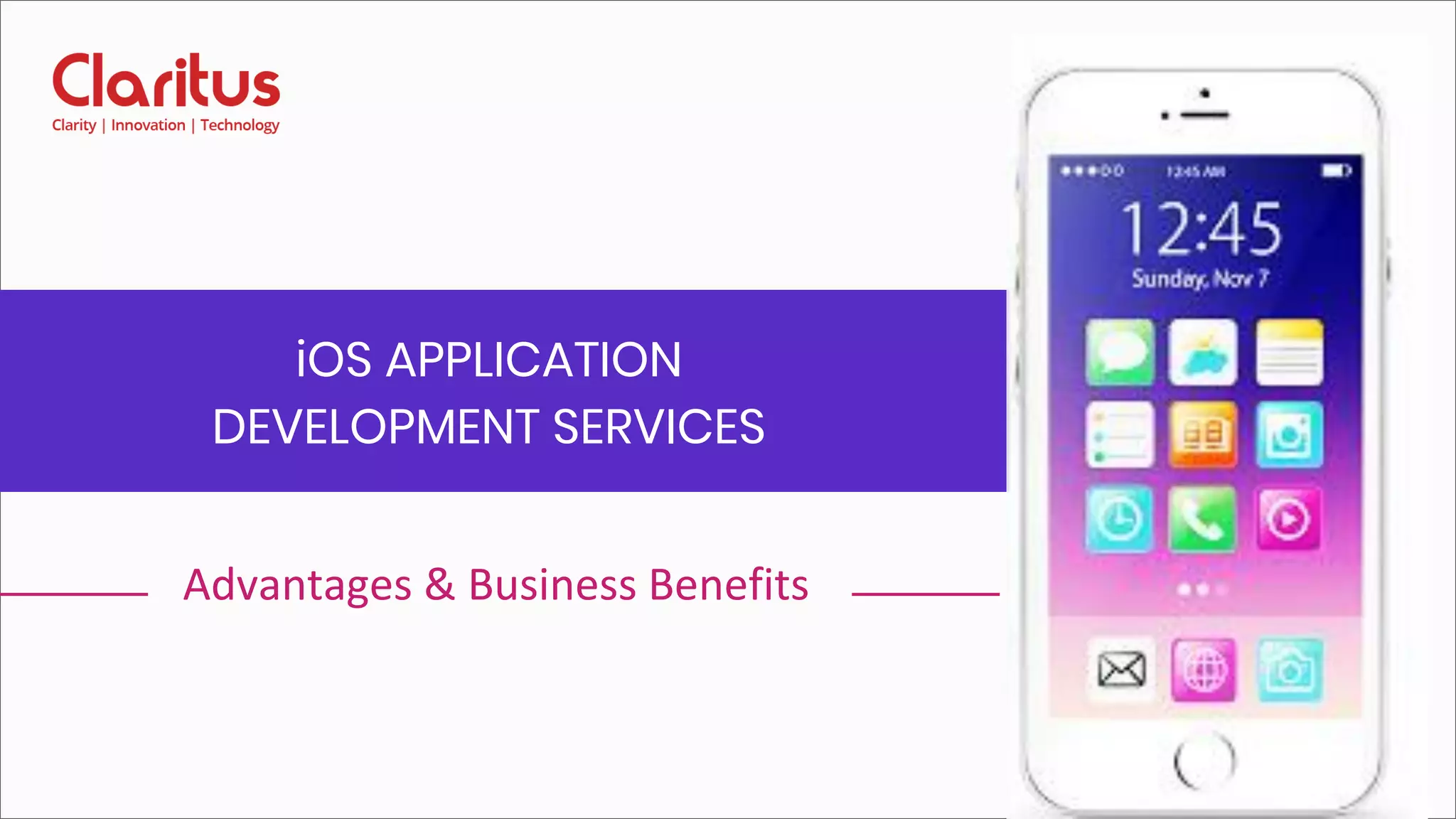 The document outlines the advantages and business benefits of iOS application development, highlighting the immense job opportunities and favorable career growth in this field. It discusses major iOS development frameworks, the development procedure, and advantages of iOS over Android. Additionally, it promotes Claritus as a provider of iOS development services, detailing their expertise and post-deployment support offerings.