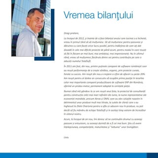 Totalsoft a realizat o creștere de peste 20% a cifrei de afaceri în 2011, consolidându-și poziția de lider în domeniul software-ului ERP din România. Compania a semnat recente parteneriate strategice și a dezvoltat soluții inovatoare, cum ar fi charisma hcm, consolidându-și prezența pe piețele internaționale. Direcția viitoare include extinderea într-o nouă subsidiară în Austria și continuarea inovației în produsele și serviciile oferite.