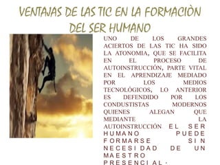 The document discusses some of the benefits of using information and communication technologies (ICTs) in education. It argues that ICTs facilitate autonomy in the learning process and self-instruction, allowing students to learn without a physical teacher. Developing a sense of responsibility is an important element that is formed through ICT-based learning. Efficiency is another important factor when incorporating ICTs into the educational process, saving time and resources like paper. One of the main challenges is providing proper guidance to students on using these tools to facilitate cognitive activity and connection with others. The greatest challenge for teachers is to continually train themselves in using ICTs and apply them appropriately without losing sight of their educational goals.