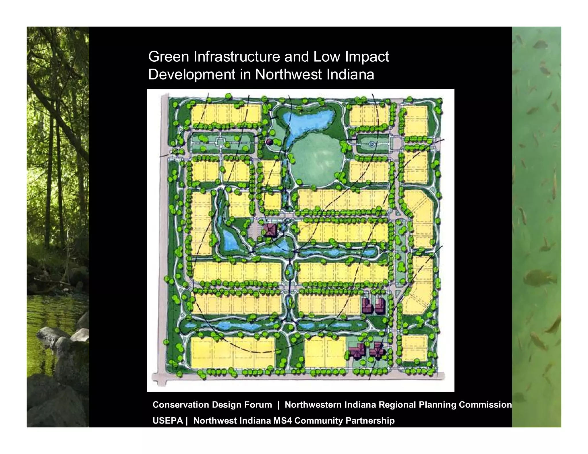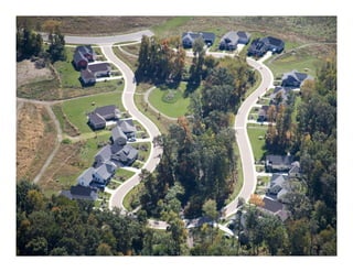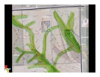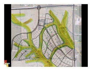 The document discusses low impact development (LID) and green infrastructure strategies that aim to manage stormwater runoff and emulate natural hydrologic functions. LID focuses on using distributed, small-scale stormwater controls and preserving natural areas to reduce impervious surfaces and runoff. Examples of LID strategies and benefits are provided, including reduced infrastructure costs, improved water quality, and increased property values. Case studies show LID development can yield more lots at a lower overall cost compared to conventional development.