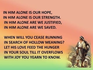 The document expresses that all hope, strength, justification, and salvation come from God alone. It asks what else can satisfy the emptiness in our hearts if not God, and encourages the reader to stop searching elsewhere and instead find meaning by letting God's love fill their soul. It repeats the refrain that all things come from God alone.