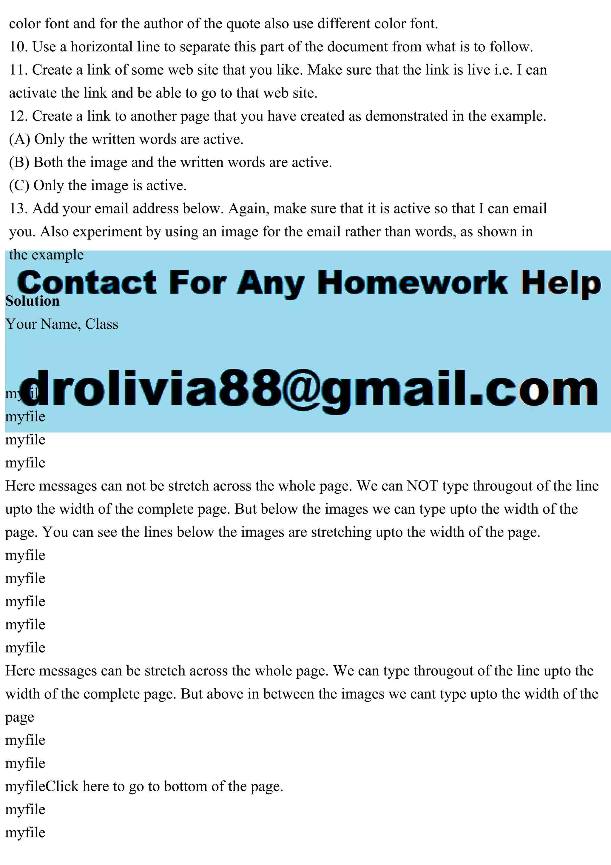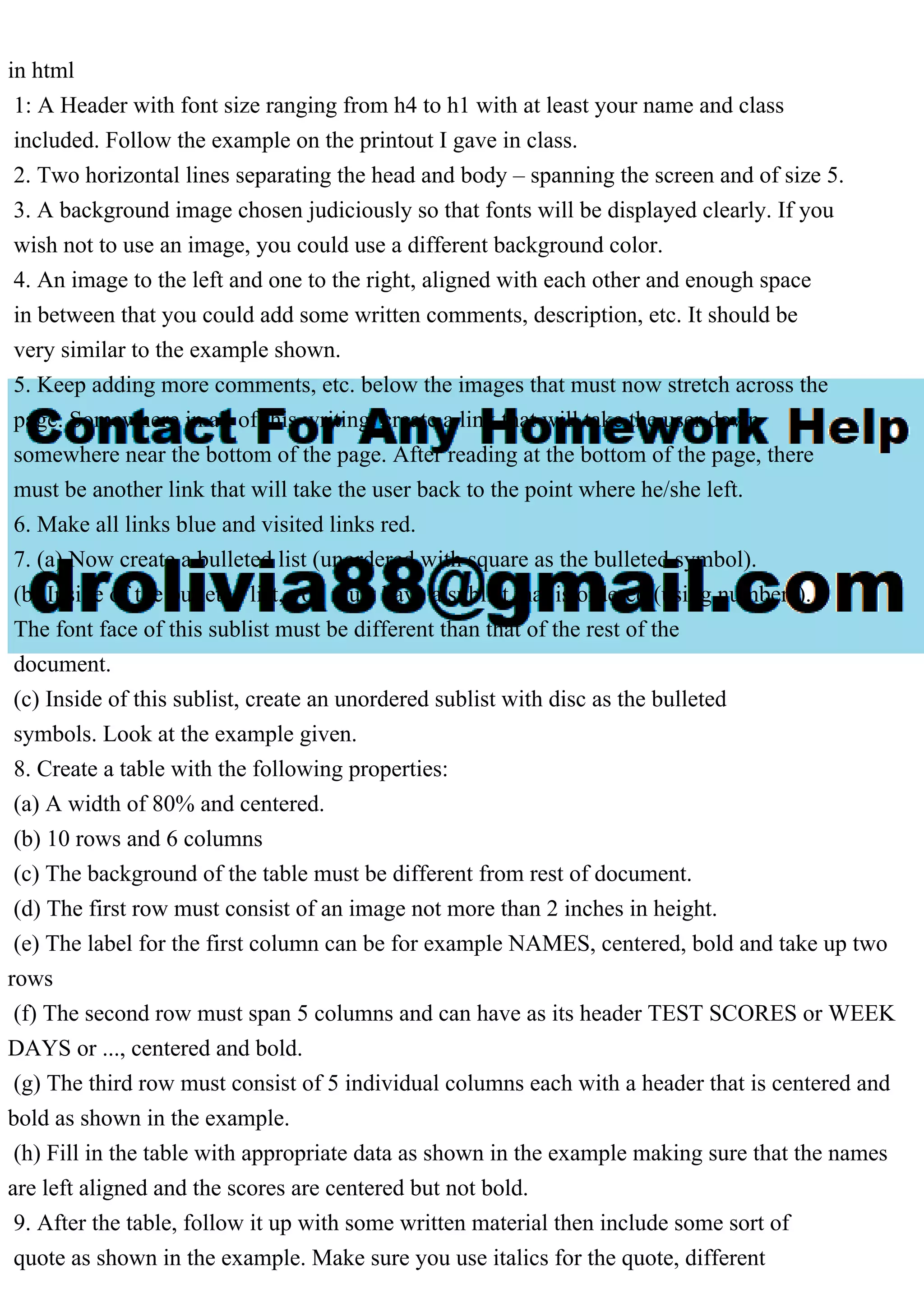 The document outlines a detailed set of instructions for creating a webpage, specifying various elements such as headers, images, background, lists, tables, links, and email functionality. Key features include formatting requirements for text and images, the layout of a bulleted list with sublists, and the creation of a table with specified dimensions and properties. Additionally, the document emphasizes the importance of active links and interaction elements, ensuring user engagement throughout the page.