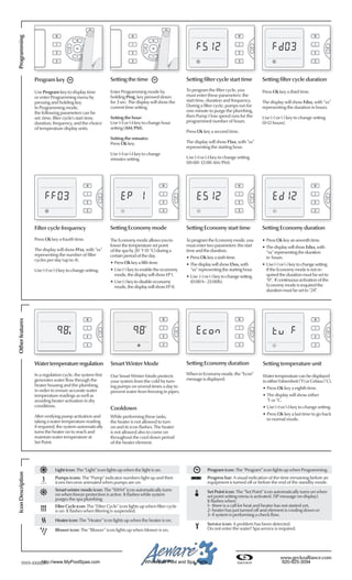 2) Instructions for programming settings for the time, filter cycles, economy mode, and temperature unit (Fahrenheit or Celsius).