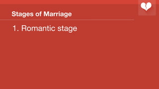 The document outlines the stages of marriage, highlighting romantic, bargaining, coercive, desperation, and acceptance phases. It discusses the negative implications of divorce, including financial and emotional harm, while promoting a perspective that values marriage as a covenant and encourages realistic wedding vows. The text emphasizes the importance of considering alternatives to divorce and acknowledges that both partners are flawed and require commitment.
