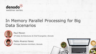 The document outlines a webinar series on data virtualization, focusing on key challenges in data integration and performance for big data scenarios, as presented by Denodo's experts. It covers various topics including modern data architecture, big data integrations, and optimization techniques, specifically highlighting the use of Hadoop as a data source and processing engine. The session aims to showcase best practices for efficiently managing large data volumes without requiring data replication.