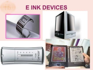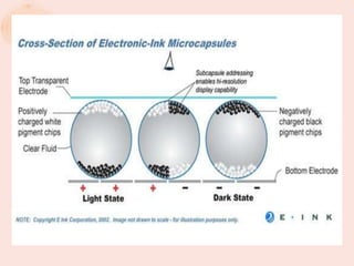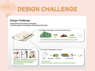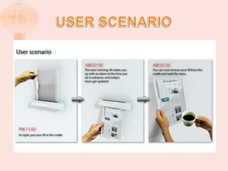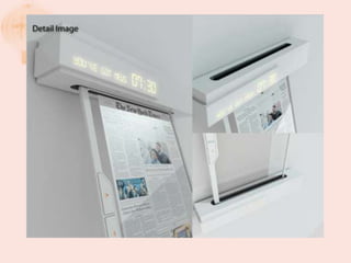 This document presents an electronic newspaper design called IN. It uses a flexible display and Wi-Fi technology. The screen displays the current time and other information on an LED display. It can be attached anywhere. The design won a bronze award. It also describes how e-ink displays work using microcapsules containing black and white particles and a clear fluid. By applying a charge, the particles rearrange to display text or images. An analysis is given of how electronic newspapers can reduce paper usage and tree cutting while being more convenient and environmentally friendly than printed newspapers.