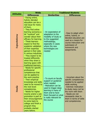 The document discusses some key differences and similarities between working adult students (WASs) and traditional students in terms of their knowledge/abilities, self-concept, expectations, needs, and attitudes towards learning. WASs tend to have specific practical knowledge but lack theoretical backgrounds, see themselves as "misfits", expect validation of work experience, and have needs for professional competencies. They can be resistant to change and tired from work commitments. Meanwhile, traditional students tend to be open to new methods, not tired from work, and focus on grades over achievement. Both groups prioritize short-term goals.