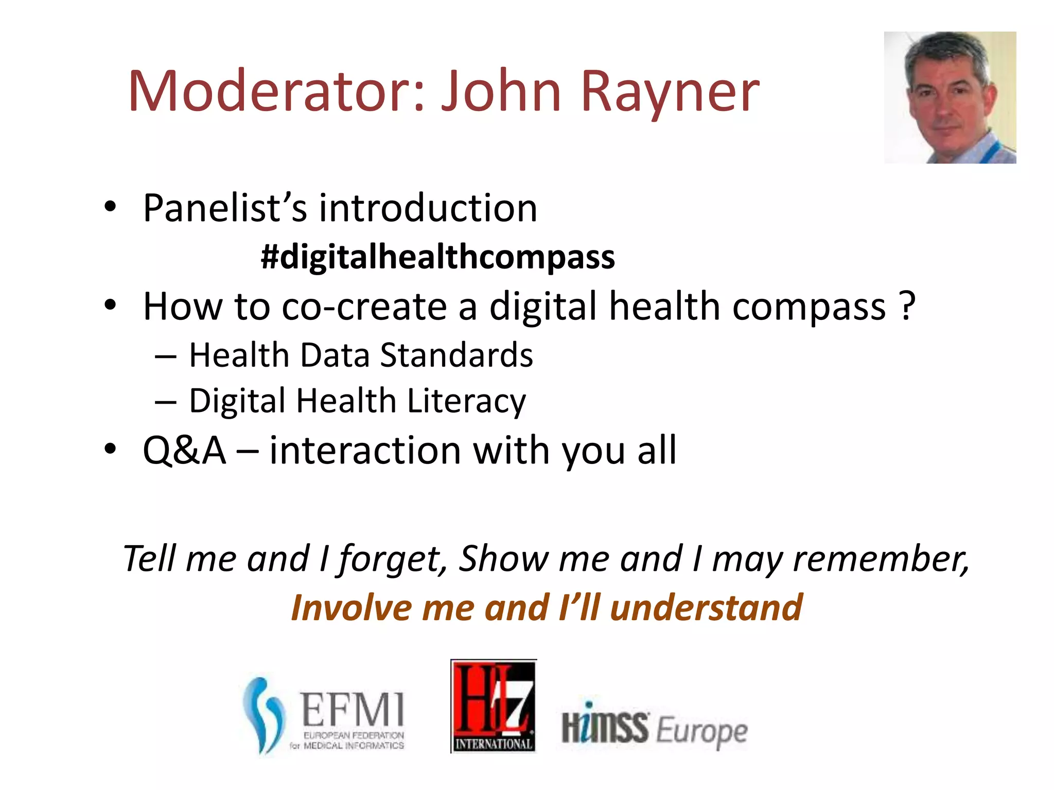 The document discusses the need for a digital health compass to empower citizens, patients, and caregivers in navigating digital health technologies and ensuring better health outcomes. It emphasizes the importance of co-creating health data standards and enhancing digital health literacy to address health disparities and improve the adoption of eHealth services. Various strategies and stakeholder collaborations are suggested to promote personalized health experiences and facilitate meaningful engagement in health care.
