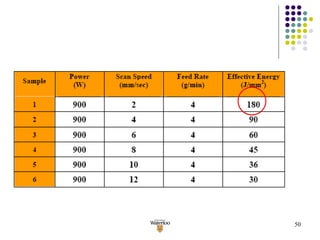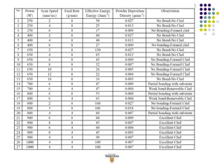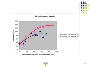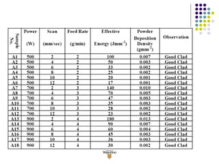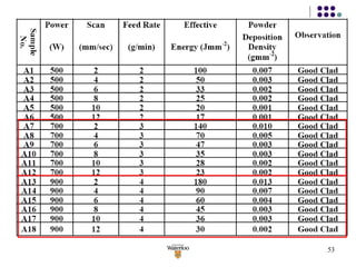 1) High quality coatings with complete metallurgical bonding between the clad and substrate were produced without porosity or cracks by optimizing laser processing parameters like power, scan speed, and powder feed rate.
