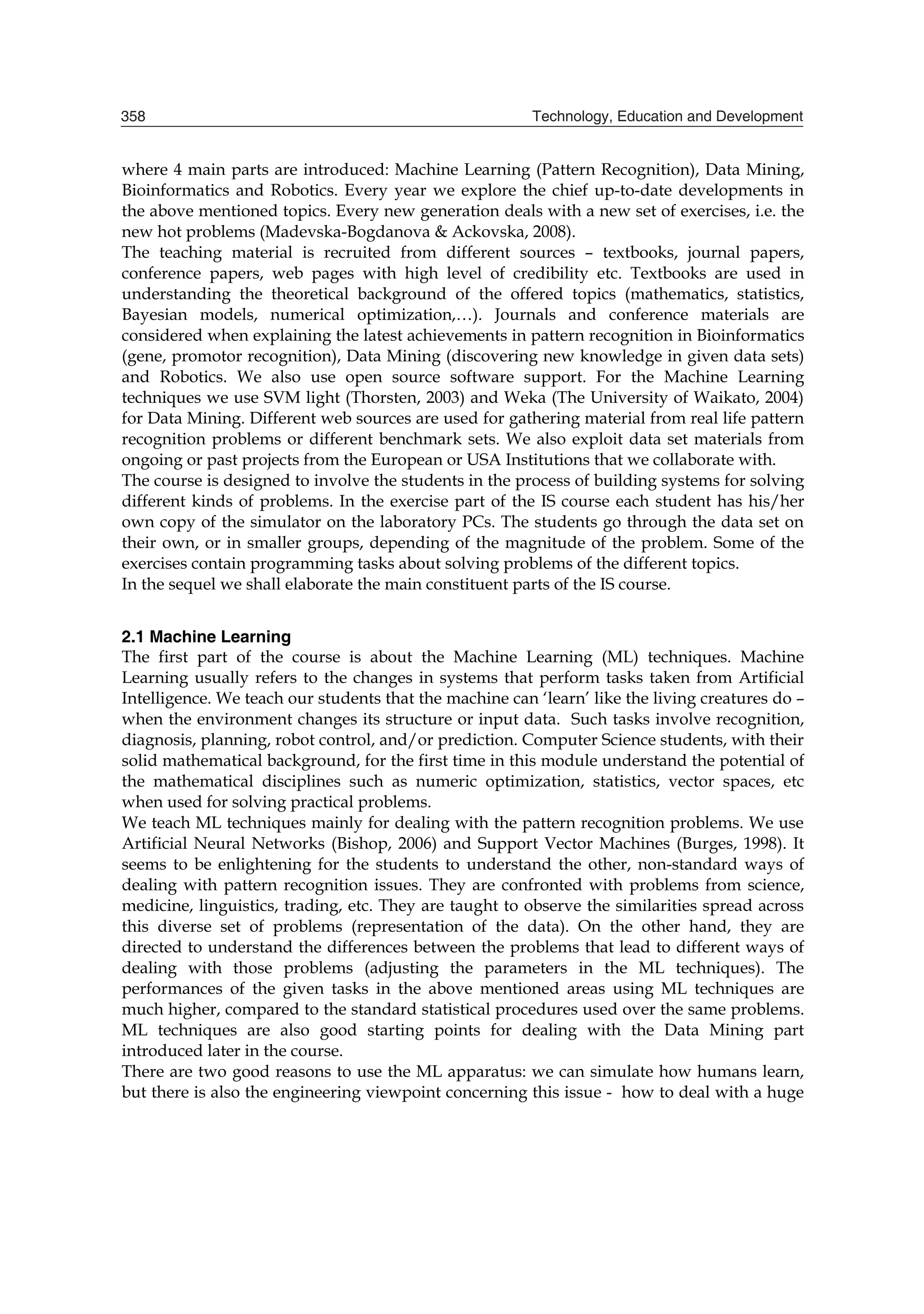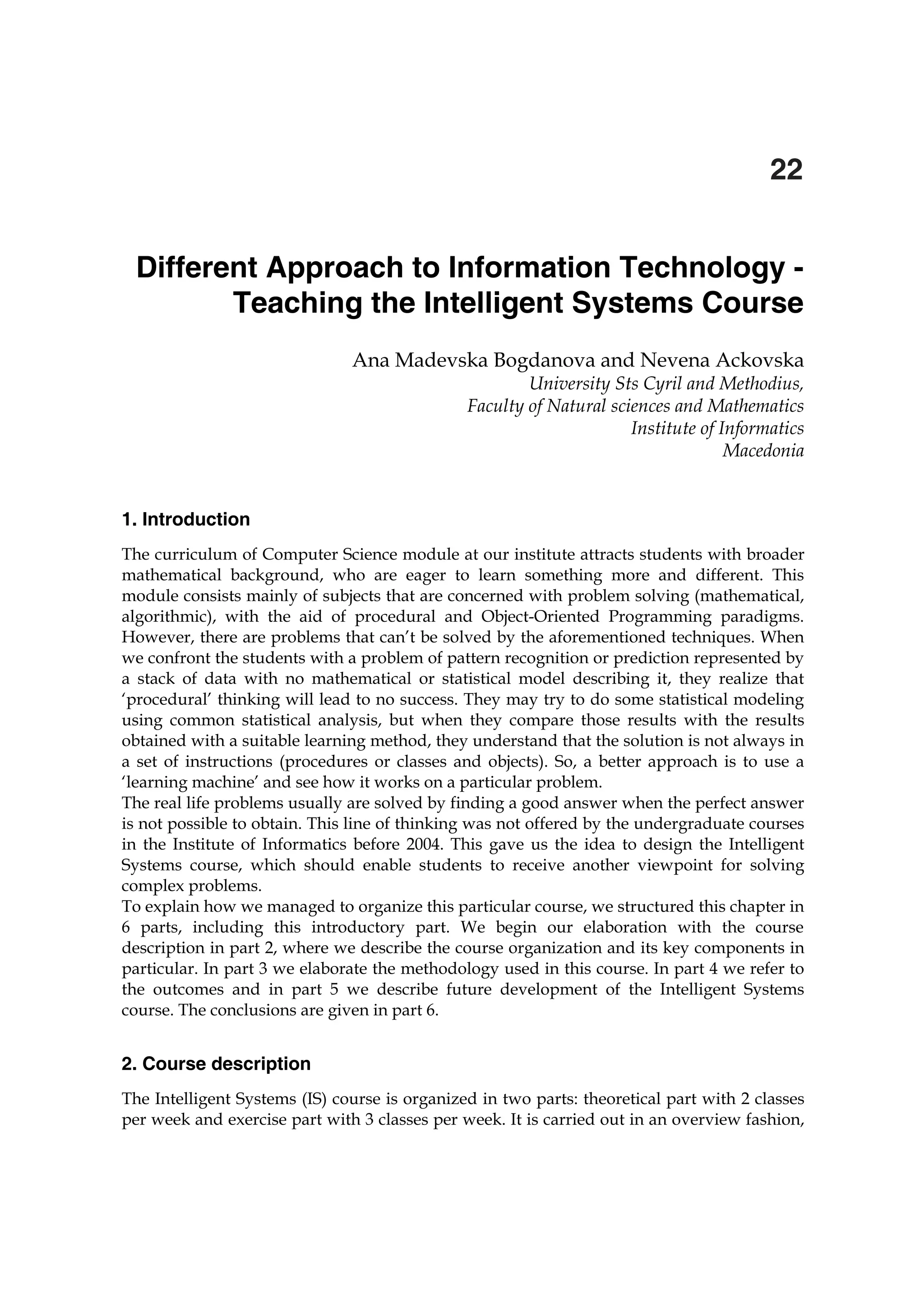 This document describes an Intelligent Systems course taught at the University of Sts Cyril and Methodius in Macedonia. The course was designed to provide an alternative perspective for solving complex problems compared to traditional programming courses. It covers topics like machine learning, data mining, bioinformatics and robotics. The course includes both theoretical and practical components. In the practical sessions, students work through exercises applying machine learning techniques to real-world pattern recognition and other problems. The goal is for students to understand how learning machines can be used to find good solutions when perfect answers may not be possible.