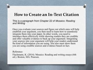 The document discusses how to create in-text citations when integrating sources into academic writing. It explains that in-text citations include the author's last name, year of publication, and page or paragraph number if quoting directly from the source. For paraphrasing or summarizing a source, only the author's name and year are needed. Signal phrases can be used to introduce a source, in which case only the page or paragraph number is necessary in the citation. Different citation formats are required depending on whether the source has one or multiple authors or if the publication date is unknown.