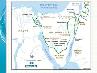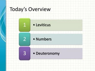This document provides an overview and summary of the books of Leviticus, Numbers, and Deuteronomy from the Torah. It discusses key events, themes, and laws contained within each book. In Leviticus, laws related to sacrifice, priests, and religious feasts are outlined. Numbers describes Israel's wanderings in the desert and repeated unfaithfulness. Deuteronomy contains Moses' farewell address at the border of the Promised Land, reviewing Israel's history and laws.