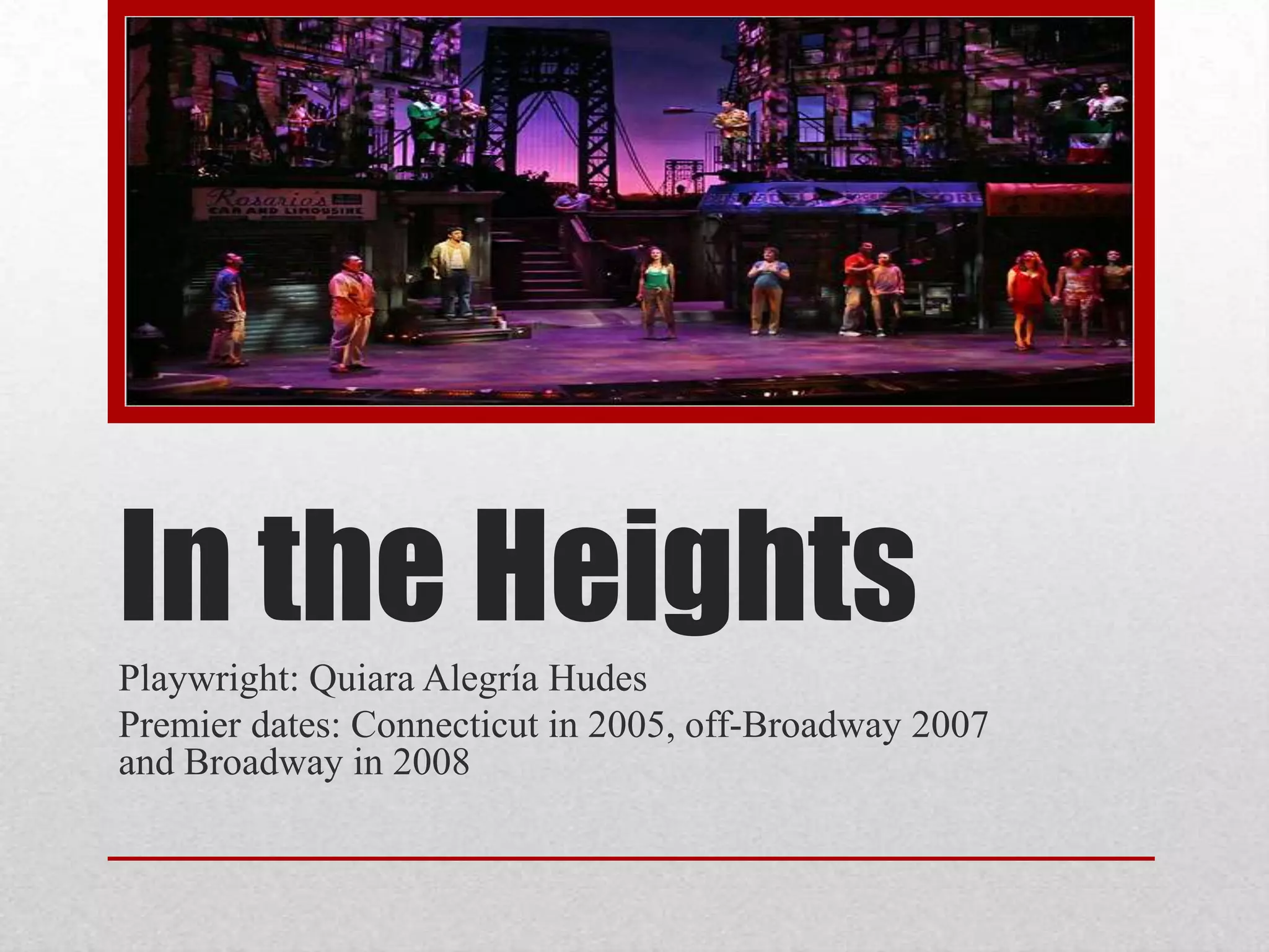 In the Heights is a musical set in Washington Heights, a Hispanic neighborhood in New York City. It follows the stories of several residents, including bodega owner Usnavi who dreams of returning to the Dominican Republic, and Nina who has dropped out of college. Over the course of a hot summer day that culminates in a blackout, the characters grapple with their dreams and relationships as their community faces impending changes.