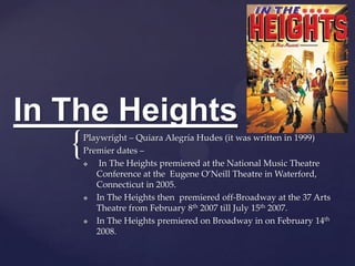 In The Heights is a musical that premiered in 2005 about the largely Hispanic American community in the Washington Heights neighborhood in Manhattan. The musical explores the relationships between various characters, including Usnavi who owns a bodega, Nina who has returned home from Stanford, and their friends as they each deal with struggles of daily life and dreams of better opportunities. Over the course of the musical, the characters grapple with issues like financial instability, relationships, and cultural identity amidst the hot summer days in their tight-knit community.