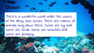 The document describes various ocean animals including lionfish, sea turtles, octopuses, coral reefs, sea anemones, sea dragons, crabs, dolphins, anglerfish, jellyfish, dugongs, manta rays, and whales. It notes characteristics of each animal such as lionfish having dangerous spines, sea turtles swimming long distances and laying eggs on beaches, octopuses changing color and squirting ink, coral reefs being home to many fish, sea anemones catching fish with tentacles, sea dragons camouflaging as plants, crabs having pincers and the largest being the Japanese spider crab, dolphins swimming fast and playing with boats, angler